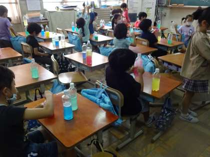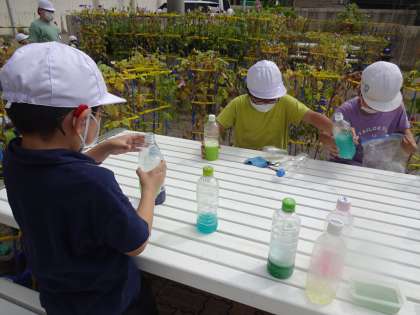 図画工作科「カラフルいろみず」の学習では、絵の具をまぜた水をふって、いろんな色水を作りました。ジュース屋さんみたいにいろんなきれいな色がたくさんできて大喜び。