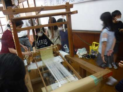 子ども達は、始めてみる織り機やまゆに驚き、実際に体験させてもらってさらに驚いている様子でした。
