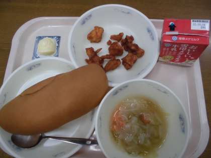 ・パンがほんのり甘くておいしかったです。チキンが程良いやわらかさでおいしかったです。スープも野菜たっぷりで、野菜のだしの味がしておいしかったです。また作ってください。(6年1組)
