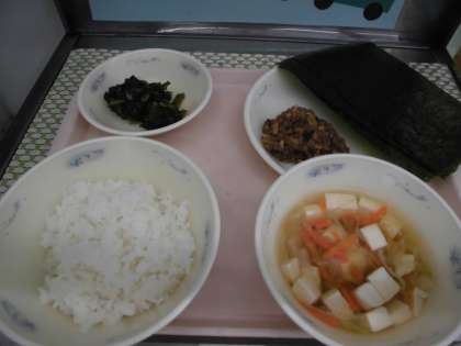・ほうれん草のおかか煮がみずみずしくて、おいしかったです。肉みそ納豆と手巻きのりがマッチしていておいしかったです。(2年3組)