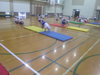 3組は、「マットあそび」の学習をしています。マットの準備もグルーブのみんなで協力して早くできるようになってきました。手をしっかりマットにつけて四つ這いになる「犬さん」や足を伸ばしたまま移動する「馬さん」、足を後ろにけりだす「かえるさん」など、毎時間いろいろなマット遊びに挑戦して楽しんでいます。