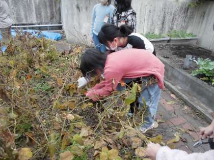 11月29日 夏前にまいた大豆を収穫しました。お世話になっている農家の藤田さんのご指導のもと、はさみで根元を切って、さやから豆を出してみました。3年生が育てていた大豆は、思うように収穫できませんでした。一方、藤田さんが育てられた大豆は、粒が大きく子どもたちは大興奮でさやから豆を出していました。収量は10倍ほど差がありました。