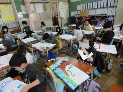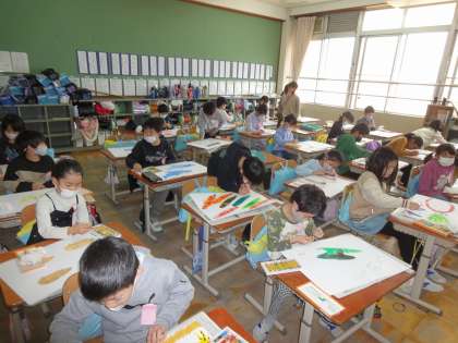 型紙を使って、動物や花、木などをうつしました。うつす場所や向きを考えてくふうして作品を作っていました。