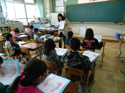 教室で子どもたちは足型をじっくり見ました。2年生以上は昨年度までの足型があるので,比較しながら足の大きさやつちふまずの形成や足の指の状態を見ています。
