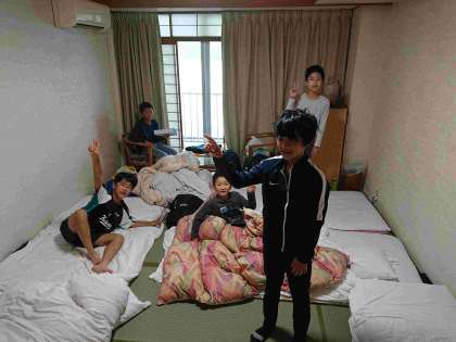 おはようございます。外は曇っていますが、穏やかな波の音が聞こえ、気持ちのいいさわやかな朝です。起床の時刻を迎え、すでに起きて動き始めていたり、まだまだ眠たそうだったり・・・。2日目の活動、スタートです!