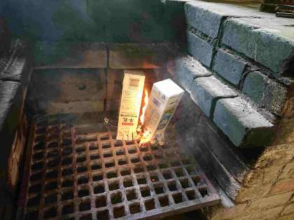 パンにキャベツとウインナーを挟んだら、牛乳パックの中に入れ、火をつけます。