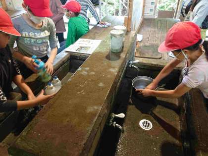 野外炊事の後片付けに奮闘中です。特に大変なのが、火にかけた鍋にこびりついた黒いすすです。友だちと交代しながら一生懸命磨きます。