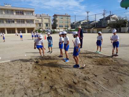 けがをしないように砂場をならし、着地をよく見て、跳んだ人に記録を伝えます。