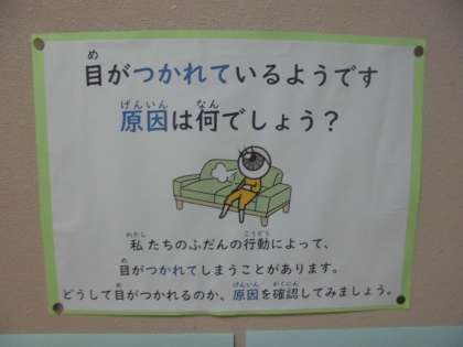 保健室前の掲示物にもあるように、目に疲れる原因は何か考えてみてください。