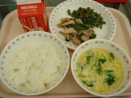 今日の献立は,「ごはん・牛乳・豚肉ときのこの梅いため・三度豆のごま煮・かきたま汁」でした。