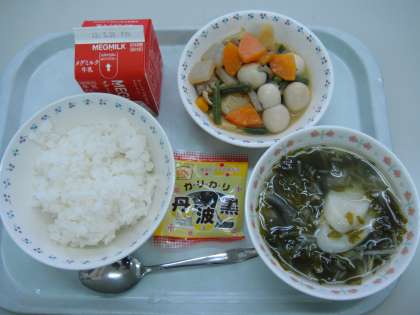 今日の献立は,「ごはん・牛乳・プリプリ中華いため・わかめスープ・黒大豆」でした。