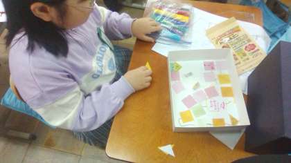 「わくわくお話ゲーム」では、知っているお話やオリジナルのお話を元にして、オリジナルすごろくを作っています。例えば、「お手紙」で考えた児童は、「かえるくんが急いで家に帰るからふりだしにもどる」や「かたつむりくんが手紙をとどけるのに時間がかかるから1回やすみ」など、マスのくふうをしていました。完成が楽しみです。