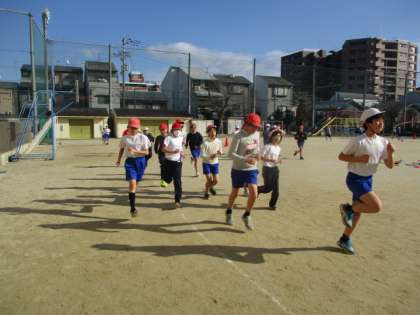 5年生では体育科でジョギング、なわとび、ソフトバレーを、ローテーションで取り組んでいます。今日はジョギングを3クラス合同で行い、みんなでジョギングの楽しさを味わいました。