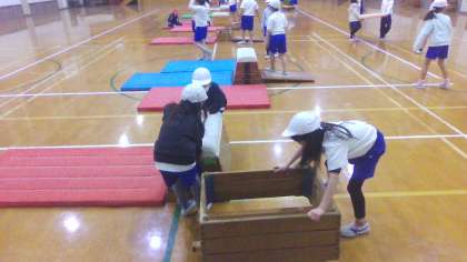 2組は体育で「マットあそび」をしています。友達と協力して準備や後片付けが早くできるようになってきました。ねらい1ではできる跳び越し方で高さに挑戦し、ねらい2では少しがんばればできそうな技に挑戦するために、段差の場やマットの場で練習をしています。