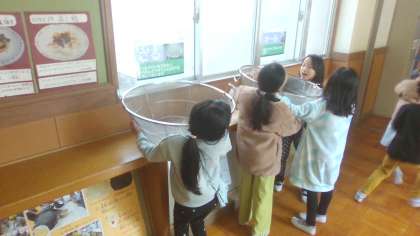 給食週間の取組で、給食室の自由見学がありました。大きなざるやしゃもじを触ったり、調理員さんが使用しているエプロンをつけたりすることができました。調理中の様子も間近に見られて、参加した子どもたちはとても喜んでいました。