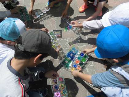 透過性のある卵パックやペットボトル、びんやプリンカップなどに色をつけ、光を通したときに楽しい見え方になるように工夫しました。今日は午後からお天気もよくなったので、外に出て、材料に太陽の光を当て、形や色をうつすことを楽しみました。