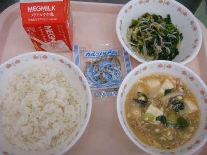 今日の献立は,「麦ごはん・牛乳・五目豆腐・ほうれん草ともやしのいためナムル・じゃこ」でした。