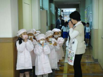 ※1年生の当番の様子です。給食室前で「いただきます!!」とあいさつをします。