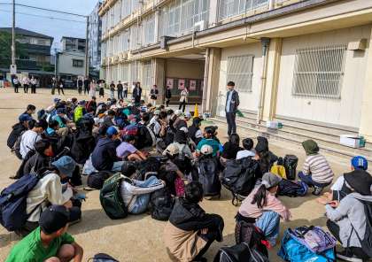 出発式で約束やルールを確認し、いよいよ修学旅行に出発します。たくさんのお見送りありがとうございます。