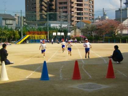 3年生が50メートル走のタイムを計りました。準備運動とスタートの練習を入念にしたあと,4人ずつ走ってタイムを計りました。