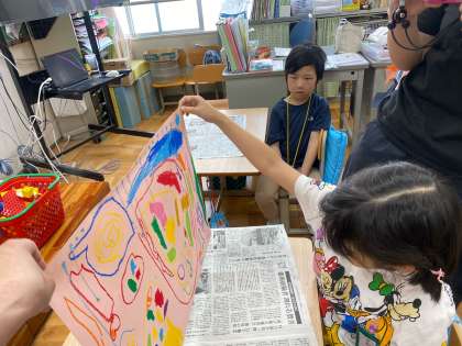 図工の時間に、雨の日に登場するものをみんなで考えました。カエルやカタツムリ、傘、あじさいなどの言葉があがり、パスを使って子どもたちは思いおもいに描きました。その後に、絵の具が入ったスポイトを使って、画用紙の上に絵の具を落とし、画用紙を傾けるとパスで描いたものの上にいろいろな色の雨を降らすことができ、子どもたちは嬉しそうでした。音楽の時間に「雨あられ」の歌遊びを行っていたので、その歌をうたいながら絵の具の雨を降らしている子どももおり、楽しそうでした。完成した子どもたちの作品は、6月8日の休日参観までに教室に掲示する予定です。ぜひご覧ください。
