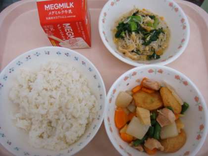 今日の献立は,「麦ごはん・牛乳・平天とこんにゃくの煮つけ・もやしの煮びたし」でした。