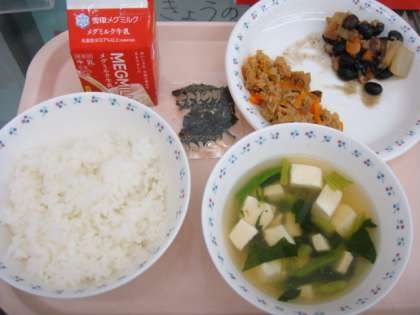 今日の献立は,「ごはん・牛乳・そぼろ丼の具・黒豆の五目煮・とうふの吉野汁」でした。