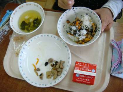 ※1年生には,「そぼろ丼の具をごはんにのせて『きざみのり』をかけて食べるよう」食べ方をていねいに説明しました。きざみのりの袋がうまく開けられず,先生に助けてもらっている子も何人かいました。
