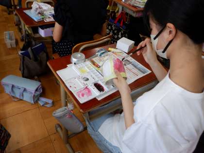 図画工作科「すてきな明かり」の学習で、今日はランプシェードの色つけをしました。暗い小部屋で光り方を確認しながら、工夫して作っていました。