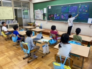 図工の時間に、子どもたちが描いたあじさいの絵の鑑賞を行いました。自分の作品の工夫したところや頑張ったところ、友達の作品の良いところについて作品を鑑賞しながら伝え合いをしました。どの子もみんなの前で発表することができ、自分のおもいを伝えることができました。作品は、今後わかたけ学級の教室や校内に掲示する予定です。子どもたちの作品をぜひご覧いただけたらと思います。