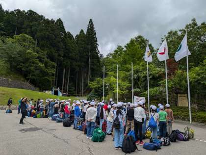 山の家に到着しました。早速、入所式を行います。校旗を掲げ、校歌を歌いました。所員さんのお話を聞いていよいよ活動スタートです!