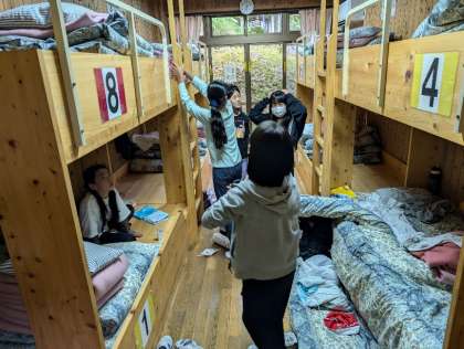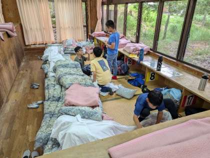 起き出した子どもたちは、朝の身支度を進めています。ぐっすり眠れた子、なかなか眠れなかった子、様々です。