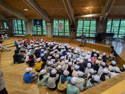 オリエンテーションホールに集まり、朝の集いを行いました。同じ日程で山の家に来ている正親小学校と合同で行いました。