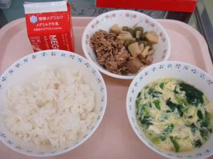 今日の献立は,「胚芽米ごはん・牛乳・なま節とふきの煮つけ・かきたま汁」でした。