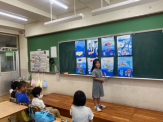 図工の時間に、絵の具やパスを使って「海の中の絵」の作品を作りました。作品を掲示し、自分の作品の気に入っているところや工夫したところ、ストーリーなどを前に出て紹介しました。次に、友だちの作品の上手だと思いところやすごいと思うところを発表しました。この鑑賞を通じて、お互いを認め合うことを大切にしながら鑑賞することができました。