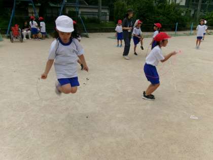 手首をうまく回して跳ぶ子、走るリズムに合わせて跳ぶ子。