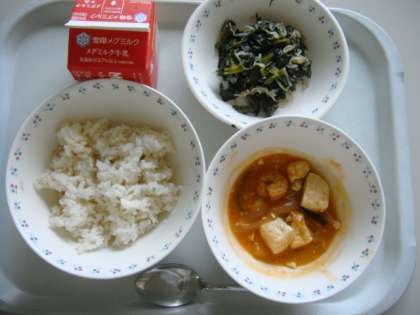 今日の献立は,「麦ごはん・牛乳・えびと豆腐のケチャップ煮・ほうれん草ともやしのいためナムル」でした。