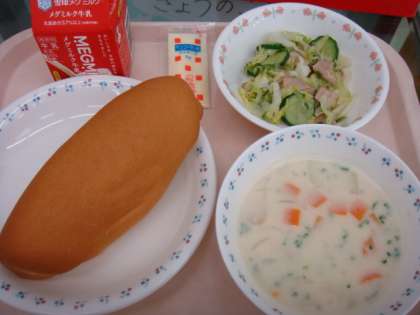 今日の献立は,「コッペパン・牛乳・ハムサンドの具(マヨネーズ1袋)・チャウダー」でした。