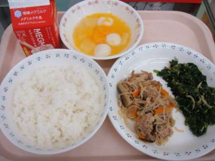 今日の献立は,「ごはん・牛乳・豚肉とこんにゃくのいためもの・ほうれん草とじゃこのいためもの・フルーツ白玉」でした。