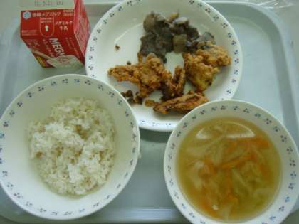 今日の献立は,「麦ごはん・牛乳・あじのこはくあげ・里いもとこんにゃくの土佐煮・キャベツの吉野汁」でした。