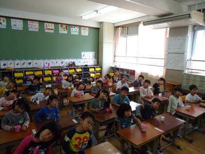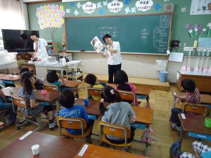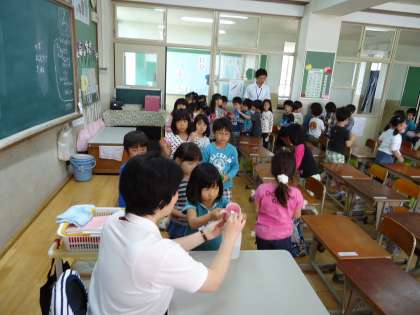 今週の水曜日のフッ化物洗口に向けて(木曜日が遠足のため振り替えています)今日からフッ化物洗口の練習を始めました。練習は絵カードを見てお水でぶくぶくうがいをしています。みんな上手にできていました。