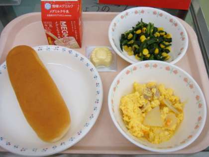 今日の献立は,「ミルクコッペパン・牛乳・スパニッシュオムレツ風・ほうれん草のソティ・型チーズ」でした。