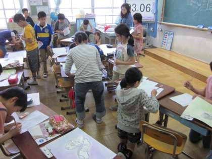 5年生では,図工の時間に「自分のくつをよく見て描く」という学習をしてきました。 今日はその観賞会です。お互いに絵を見あって,コメントを書いたり,発表を聞いて,感じたことを伝える学習をしました。一人一人が個性的な絵を描いていました。