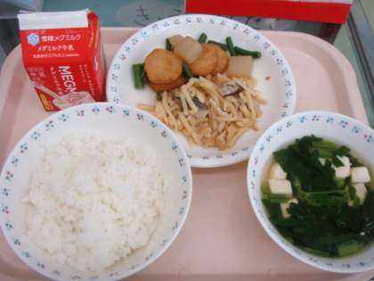 今日の献立は,「ごはん・牛乳・たけのこごはんの具・平天の煮つけ・すまし汁」でした。