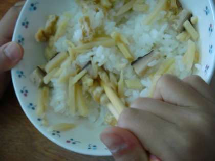 「私は,たけのこごはんのぐをかけたごはんがおいしかったです。理由は,たけのこのシャキシャキかんがごはんを食べやすくして,とてもおいしかったです。」