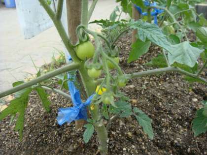 2年生のトマトは,黄色の花がさき,実をつけています。