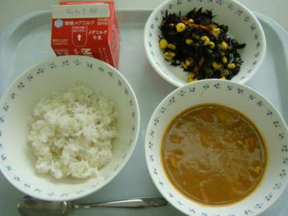 今日の献立は,「麦ごはん・牛乳・チキンカレー・ひじきのソティ」でした。