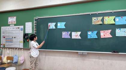 「目の形がかっこいい。」「色がきれい。」など自分の言葉で友だちの作品のステキをたくさんみつけて発表できました。
