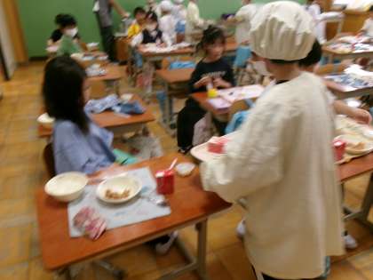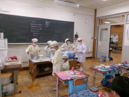 給食当番をてきぱきとこなす3年生。