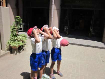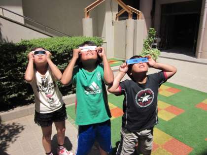 先日の金環日食に続いて,今日は太陽を金星が横切る「金星日(太陽)面通過」が観測できる日です。 子どもたちはこの前の観測で興味をもった様子で,自分でもってきた観測メガネをもって,太陽を見上げていました。